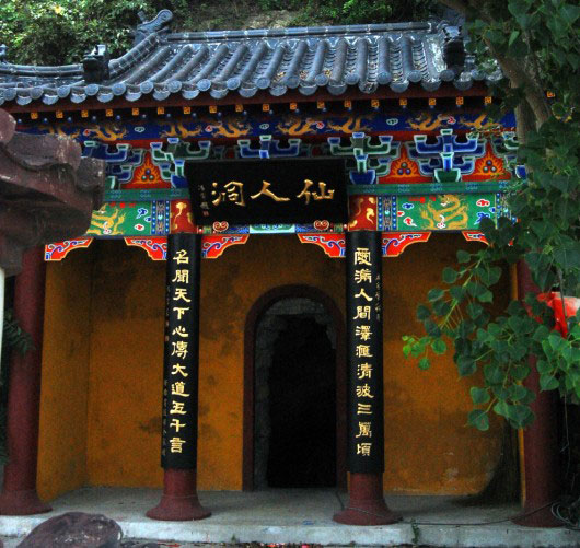 从禅寺的小院门出去,拾阶而下,有个仙人洞,洞依山而建,里面供奉着老子的塑像。洞外便是洪泽湖。站在洪泽湖边,天开水阔,远望白帆点点,湖风拂面,更觉心旷神怡。