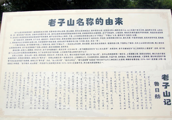 传说老子是彭祖的后代,生于淮水之滨。他的母亲因吃了水中漂来的一只李子而怀胎,孕育八十一年,生下一子白发苍苍,故取名李老子。还因耳上有三个漏,又名老聃,道号犹龙。周王朝为了开发西域,宣扬周礼,派老子西方游说,漫游中他因吃了西王母的仙草而修炼成仙。一天他骑着青牛从天廷飘落到海中一块礁石上,后海水退了,这礁石成了一座小山。他在这里修道炼丹为渔民治病,人们尊称他为太上老君,并把这座山叫老子山。