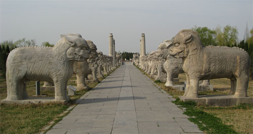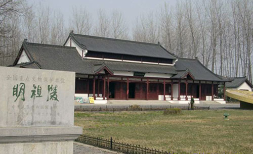 明祖陵位于洪泽湖西岸、淮河入湖口,今淮安市盱眙县境内。这一带古属泗州。明朝开国皇帝朱元璋祖籍泗州,到他父亲一代才适居安徽凤阳。朱元璋建立明朝后,命皇太子朱标到泗州祖居处、他的祖父朱初一原葬地杨家墩兴建祖陵,直到永乐十一年(1413年),工程才全部完工。此陵被称为"明代第一陵"。清康熙十九年(1680年),一场特大洪水吞没了泗州城,也淹没了明祖陵的全部建筑。直到1966年洪泽湖的枯水季节,埋藏在水底近三百年的明祖陵才重见天日,被淹埋在积沙里的石刻部分陆续露出水面。1976年,江苏省文化厅拨专款,进行了初步的整理发掘。原有桥、亭、殿、房,有的已经被埋入地下,有的被洪水冲毁。但陵前的石刻群,大多保存下来。1980年,国家文物局、江苏省文化厅又拨专款进行修复。 |