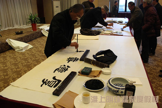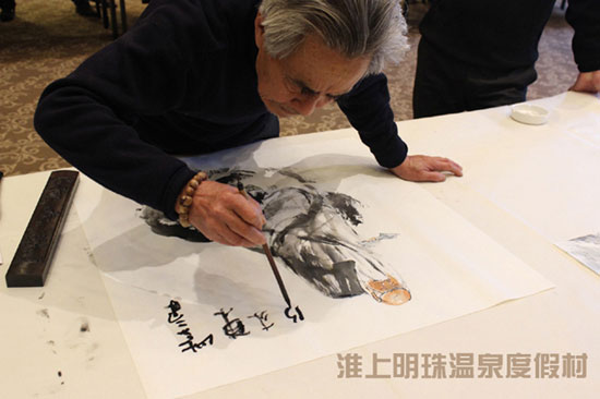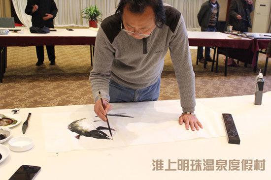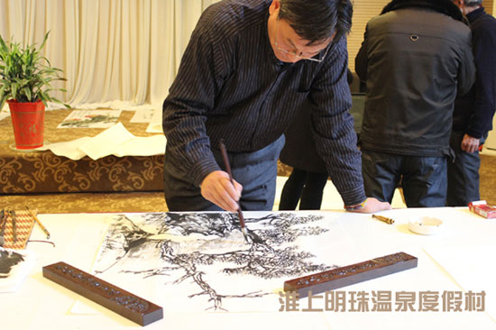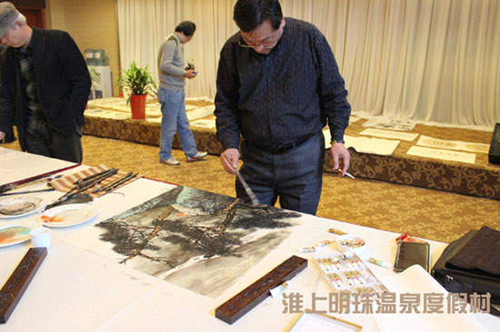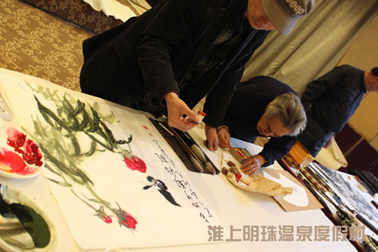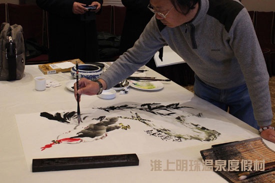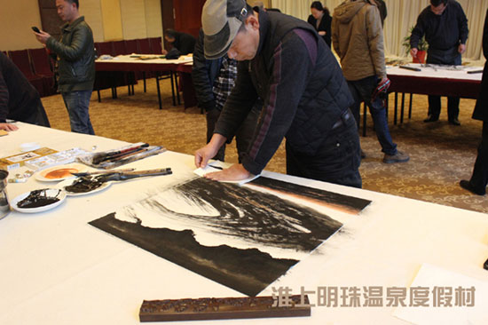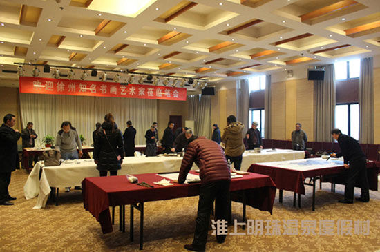 笔会以“弘扬时代文化,谱写美好生活”为主题,邀请多位徐州知名艺术书画家,莅临淮上明珠温泉度假村多功能厅。挥毫泼墨、展示书画家风采、营造文化氛围,同时也为度假村添加绚烂色彩。