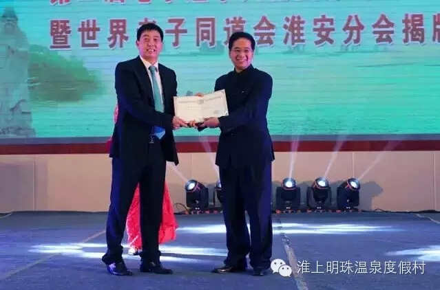 淮上明珠温泉度假村董事长陈宽有先生从世界老子同道会会长、中国国学院大学常务副校长李德深教授手中接过聘书,陈先生被聘为世界老子同道会淮安分会常务副会长兼秘书长。