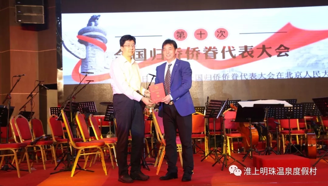 晚会演出前,陈锋为江苏富有旅游开发有限公司董事长陈宽有颁发“全国归侨侨眷先进个人”荣誉证书。